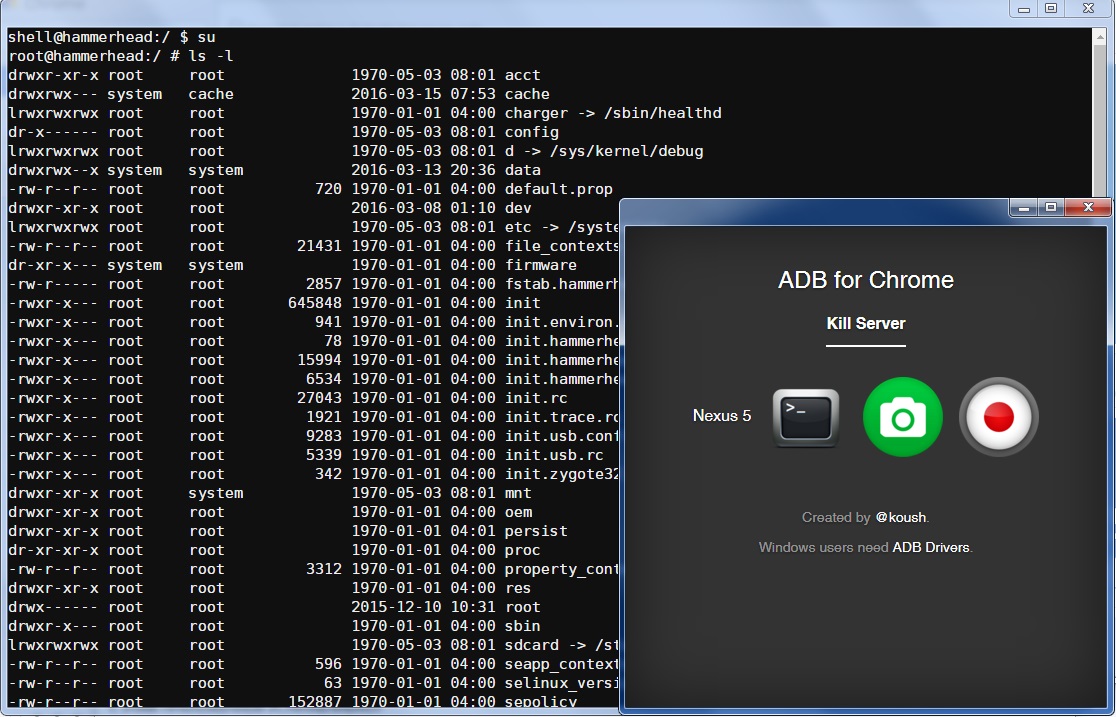 ADB for Chrome от знаменитого Koush (Koushik Dutta — один из разработчиков Cyanogen и создатель CWM recovery) позволит запускать терминал, делать скриншоты устройства, а также записывать видео с телефона, что может быть полезно для видеообзоров, инструкций и так далее. Скрины открываются сразу в браузере, а записанное видео можно найти в корне /sdcard.