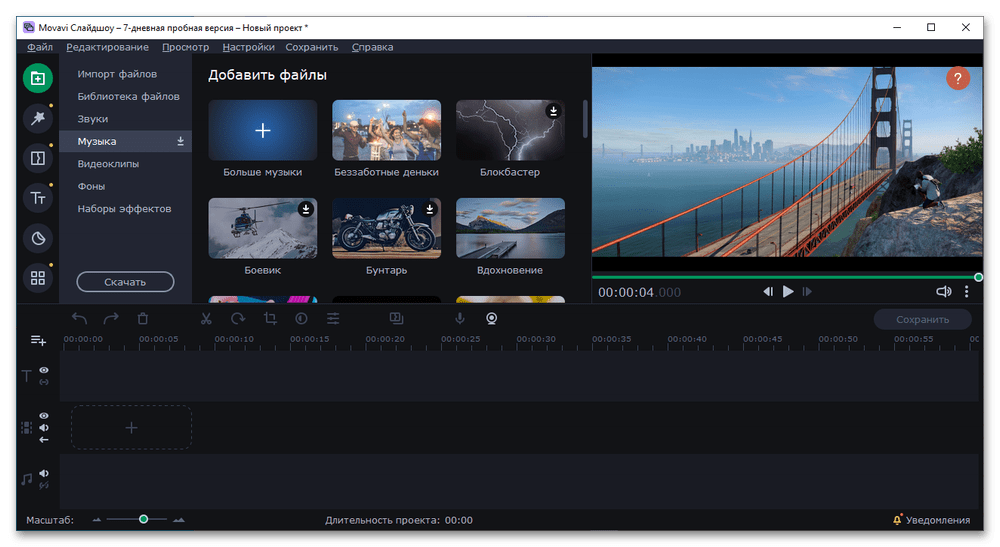 Bolide – полностью бесплатная программа для создания слайд шоу, к тому же она не подгружает рекламу и сохраняет видео без водяного знака. По функционалу Bolide отстает от предыдущих вариантов, но в нем есть все необходимое, чтобы сделать простой видеоролик с музыкой. Картинки можно обрезать и повернуть, вставить пустой кадр любого цвета и наложить статичную надпись на фото. Софт не позволяет редактировать аудио (нельзя даже обрезать длину), зато присутствует внушительная коллекция эффектов.
