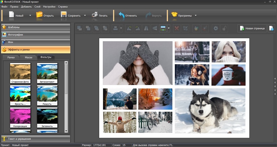 ФотоКОЛЛАЖ удобен и прост, при этом включает в себя практически неограниченные возможности для творчества. Софт позволяет создавать всевозможные типы фотокомбинаций и открыток по шаблону или вручную. Добавленные элементы можно распределять по холсту в любом порядке либо выбрать фиксированную сетку. Каждое загруженное фото можно дополнительно обработать в фоторедакторе, кадрировать и трансформировать. Итоговый результат можно сразу же распечатать или сохранить на жесткий диск как цифровой файл. Также в программе можно сжать размер изображения для загрузки в интернет без потери качества. Для новичков и тех, кто никогда прежде не пользовался подобным софтом, присутствует мастер коллажа, в котором можно создать макет буквально за несколько секунд.