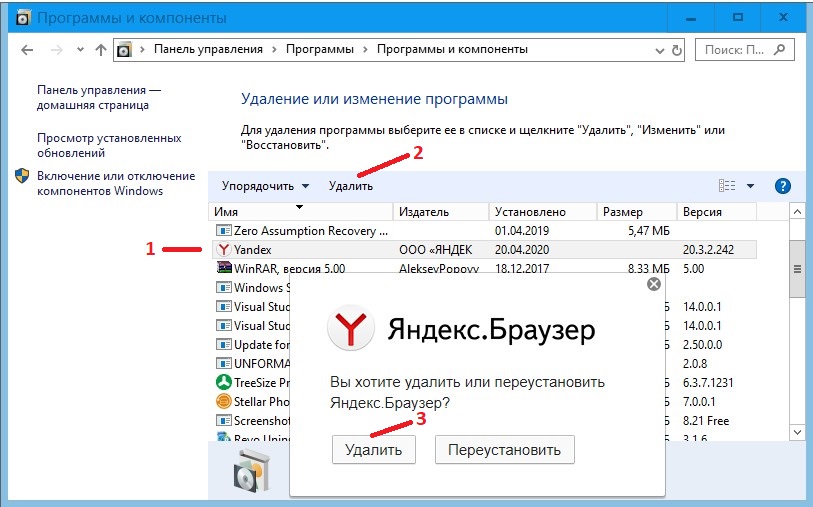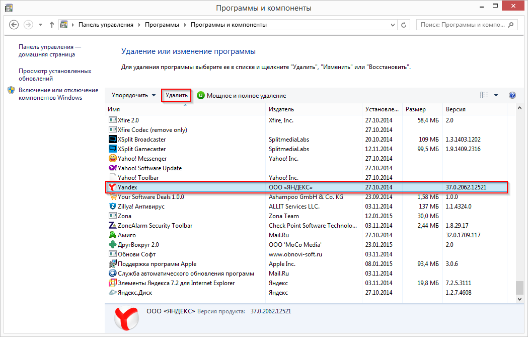 3. Нажмите в списке элемент с названием «Удалить… », «Удаление… » или «Uninstall».