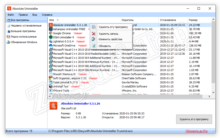 Простенький инструмент, позволяющий удалять программы, очищать следы и стирать записи в системном реестре, оставшиеся после деинсталляции. Также мы можем увидеть подробную информацию о каждом установленном приложении, например, его вес, дату установки и так далее.