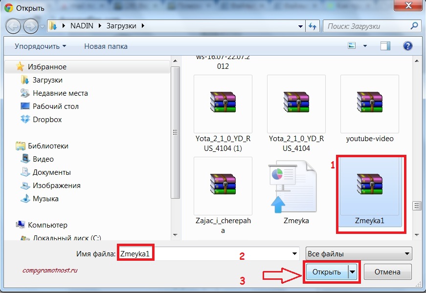 2-ой способ. На сервисе DropMeFiles подводим курсор мыши к надписи «Перетащите файлы сюда», после чего эта надпись превращается в другую: «или нажмите для выбора файлов». Нажимаем по ней и в появившемся окне воспользуемся возможностью найти на своем компьютере файл для пересылки (шаги 1-3 на рис. 4):