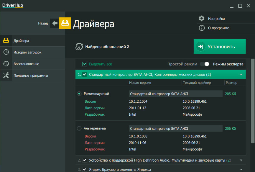 3. Переключаемся на Режим эксперта и устанавливаем галочки напротив названий устройств, драйверы которых должны быть установлены или обновлены: