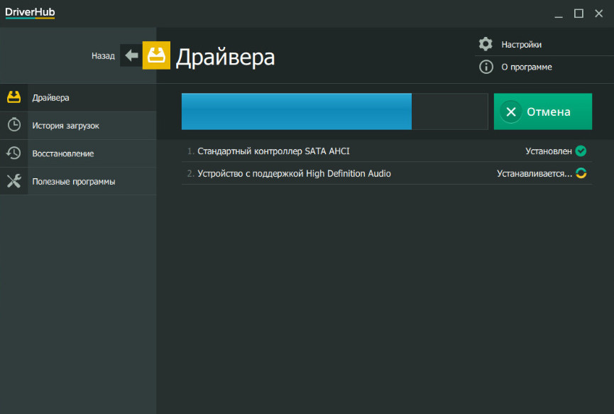 Удостоверившись в правильности выбора, нажмите кнопку «Установить». DriverHub скачает драйвера с официальных источников и произведет их установку.