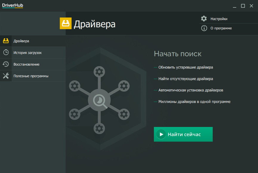 Работать с программой очень просто. Установив и запустив DriverHub, нажмите кнопку «Найти сейчас».