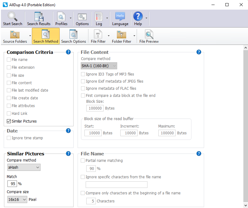 Для удобства пользователей настройки утилиты позволяют проводить поиск и по размерам, и по контрольным суммам, и по названию.