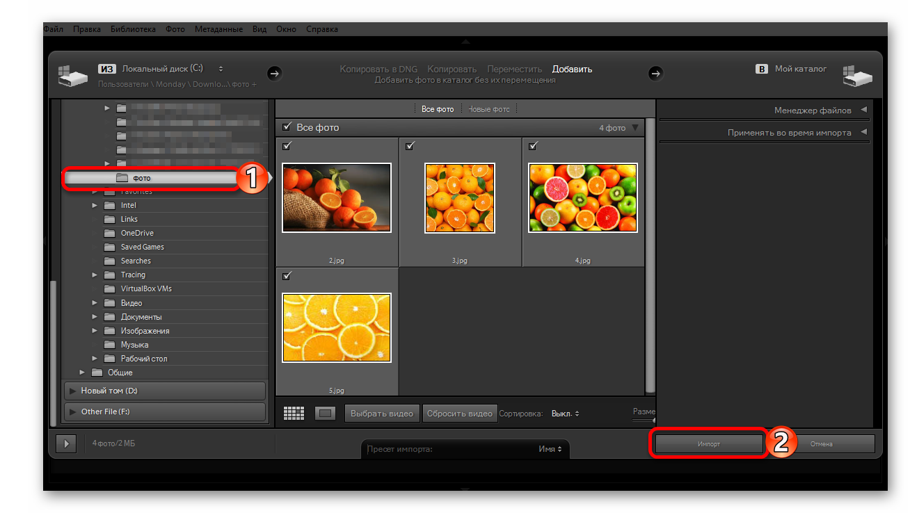 В следующем окне выберите нужную директорию с фото, а после кликните «Импорт».