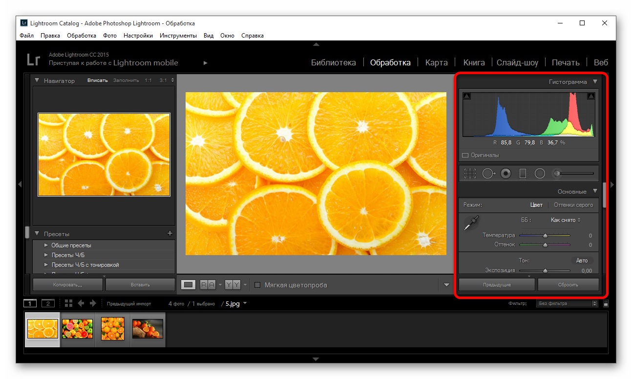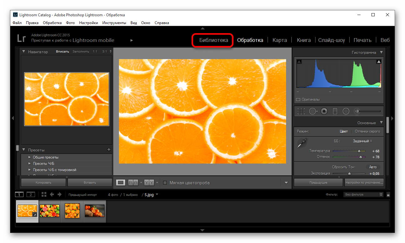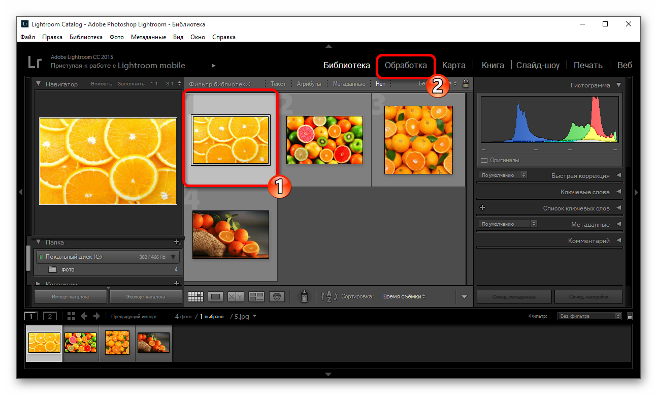 Теперь выделите одно фото, которое хотите обработать, и перейдите во вкладку «Обработка» («Develop»).