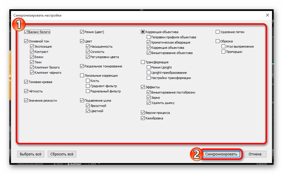 В высветившимся окне поставьте или уберите галочки. Когда вы закончите настройку, кликните «Синхронизировать» («Synchronize»).