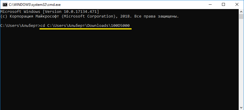 Вставляем в строку путь к папке, в которой расположены файлы, сразу после команды cd, выглядит это так: cd C:\Users\Альберт\Downloads\100D5000
