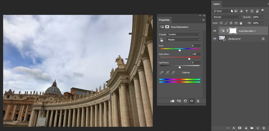 Самый простой способ добавить или убрать насыщенность — настройка Hue/Saturation (Цветовой тон/Насыщенность). В окне Layers выбираем функцию Hue/Saturation и ползунками воздействуем на цвет. Первый ползунок отвечает за распределение цвета на картинке. Перемещая его, можно одновременно изменить все цвета на изображении по всему цветовому спектру — от красного до синего. Так можно экспериментировать с цветом, делать общий тон изображения темнее или холоднее.
