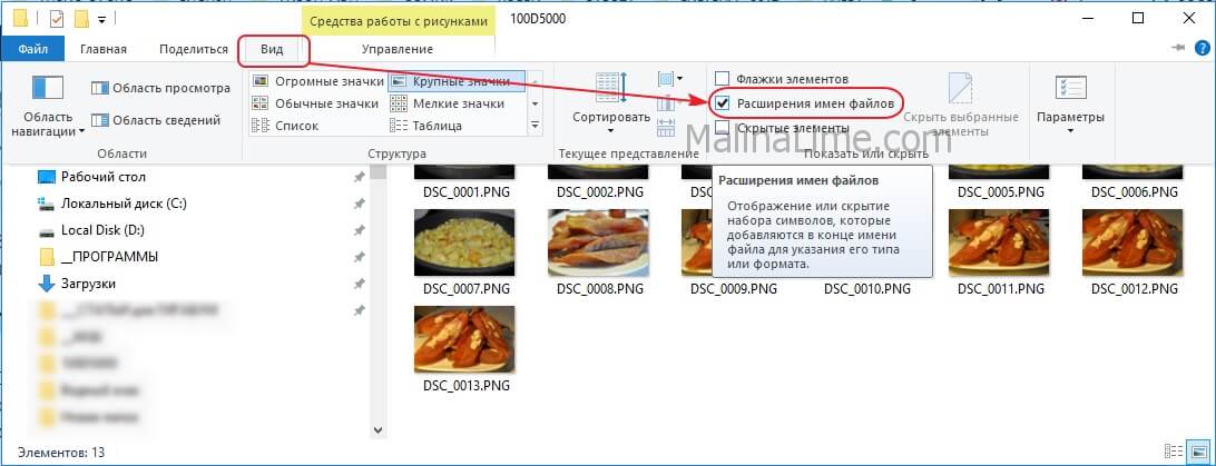 Открываем папку с файлами. По умолчанию, как правило, в имени файла расширение файла не отображается. Чтобы сделать его видимым, кликните «Вид» в верхней части окна и в раскрывшемся меню поставьте галочку в чекбоксе «Расширения имен файлов». Теперь в имени файла виден его формат (тип расширения). Если изменения сразу не вступили в силу, просто закройте папку с файлами и откройте ее снова.