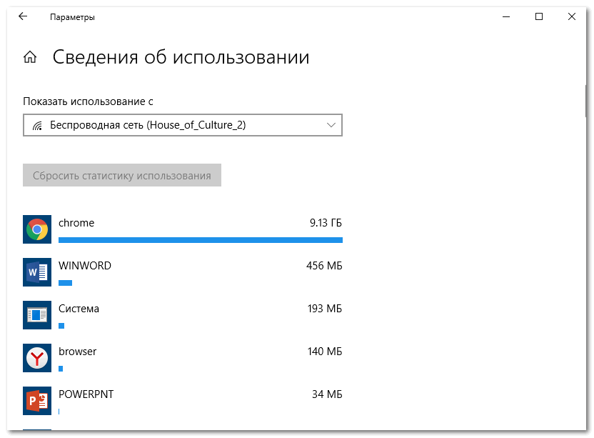 Откроется окно, где можно посмотреть, количество исходящего трафика для определенных приложений за последние 30 дней. Нажмите на кнопку «Сбросить статистику использования», чтобы очистить сведения.