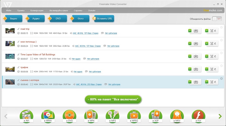 Freemake – это полностью бесплатный видеоконвертер с простым минималистичным интерфейсом. Программа поддерживается на русском языке и обладает простым управлением, поэтому пользоваться ею можно даже совершенно без технических навыков. Пакетная обработка и предустановленные настройки качества изображения значительно увеличивают скорость работы.