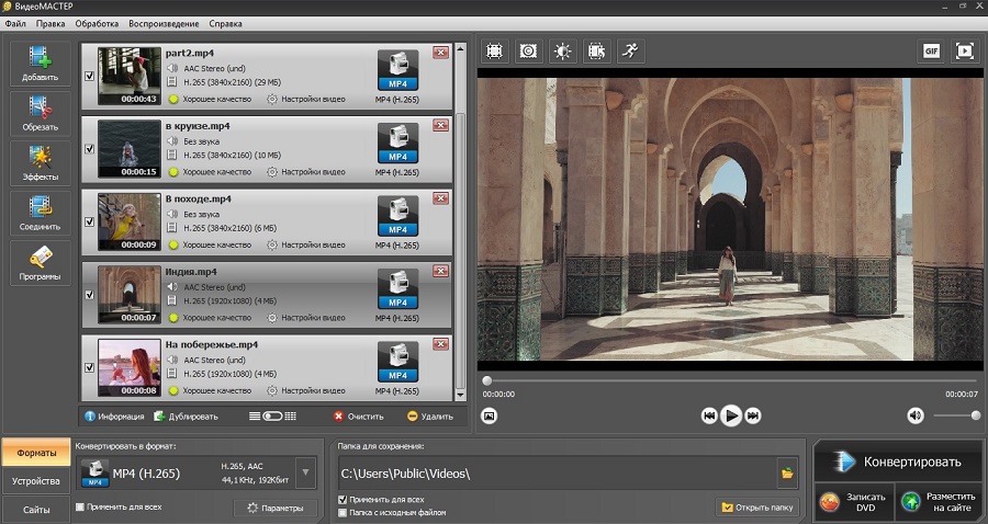 Программа для перекодировки видео ВидеоМАСТЕР работает с популярными и редкими расширениями и включает в себя полезные функции редактирования. Софт позволяет переконвертировать видеоклип с сохранением оригинальных настроек или сжать без потери качества. Дополнительно поддерживается выгрузка аудиодорожки в мп3 и другие аудиоформаты.