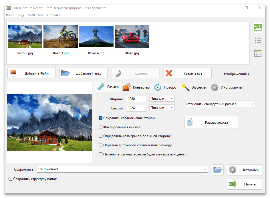 Fotosizer мало чем отличается от предыдущих программ, ведь она также разработана для изменения размера изображения в одиночном и пакетном режиме. Все главные опции в ней есть, поэтому в основном остановимся на некоторых особенностях. Предусмотрено несколько режимов, позволяющих изменить размер в соответствии с выбранными параметрами, а также дополнительный инструмент для обрезки картинки. Помимо этого, можно повернуть, перевернуть фотографию, а также изменить ее внешне с помощью набора фильтров.