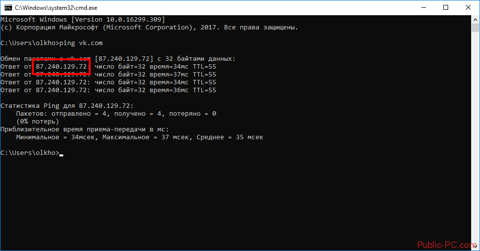 После выполнения команды вы увидите ip адрес вашего сайта (адрес, написанный после слов «Ответ от»), переписываем его или копируем себе, чтобы потом ввести в брандмауэр.