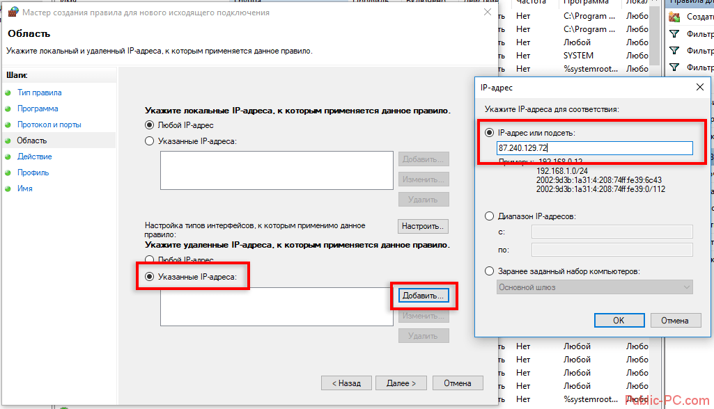 Следующим шагом будет «Область», тут в разделе «Укажите удаленный IP-адрес …» выберите пункт «Указанные IP-адреса» и нажмите кнопку «добавить». В открывшемся окне впишите IP-адрес, который вы ранее выяснили с помощью командной строки и нажмите «ОК». Переходим к следующему шагу.