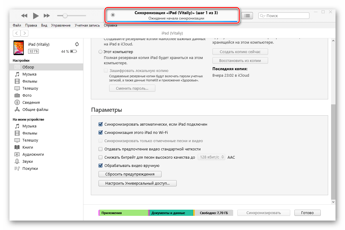 Подробнее:Как синхронизировать iPad/iPhone с iTunes Создание резервной копии данных в iTunes Восстановление Apple-девайса с помощью iTunes Отключение функции резервного копирования в iTunes Удаление резервной копии в iTunes