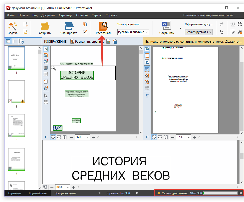 Итак, первым делом попробуем распознать документ в ABBYY FineReader. Ограничения пробной версии оказались еще более жесткие, чем в ABBYY PDF Transformer.
