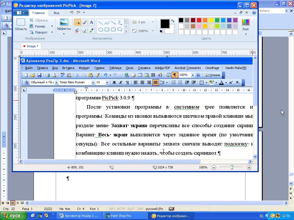 Но для создания скриншота могут потребоваться и другие способы захвата. Все эти описанные недостатки требуют для профессиональной работы использовать специальные программы. Лично я использую для этого программу Corel Paint Shop Pro. Существуют и другие программы, в частности программа PicPick 3.0.9. Скачать программу можно по адресу http://www.picpick.org.После установки программы в системном трее появляется иконка программы. Команды из иконки вызываются щелчком правой клавиши мыши. В разделе меню Захват экрана перечислены все способы создания скриншотов. Вариант Весь экран выполняется через заданное время (по умолчанию 0 секунд). Все остальные варианты захвата сначала выводят подсказку: какую комбинацию клавиш нужно нажать, чтобы создать скриншот.Перед созданием скриншота выберите формат создаваемого изображения. Для этого из контекстного меню иконки программы выполните команду Захват экрана → Формат изображения по умолчанию. Здесь предлагаются форматы: PNG, JPG, GIF и BMP. Активный формат помечен флажком.После создания скриншота автоматически открывается графический редактор, в котором можно обработать созданный скриншот, например, выделить фрагмент изображения и вырезать его.