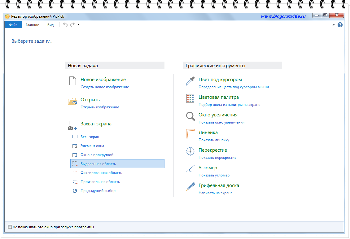 Поставьте галку напротив пункта «Не показывать это окно при запуске программы» для того, чтобы не открывать окно «Редактор изображений PicPick» каждый раз, а сразу переходить к выполнению нужной операции.