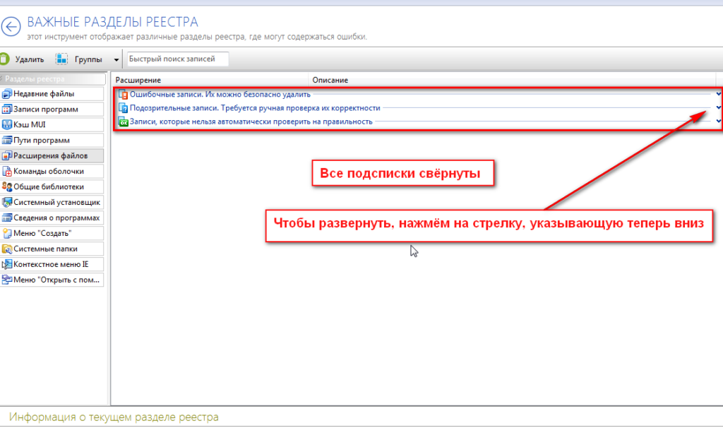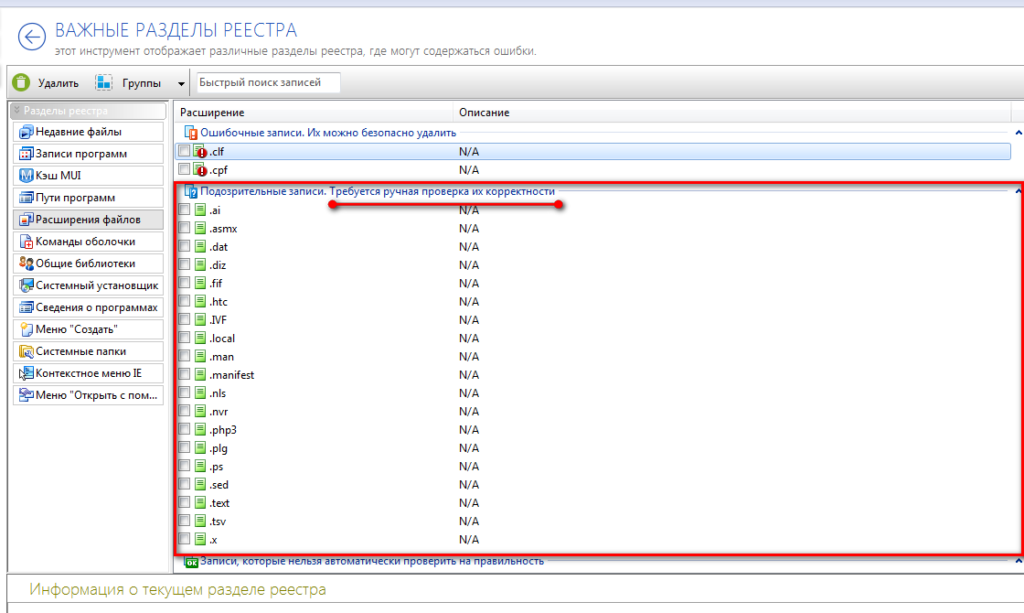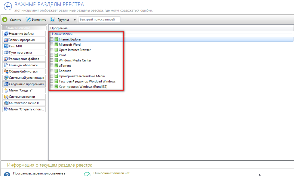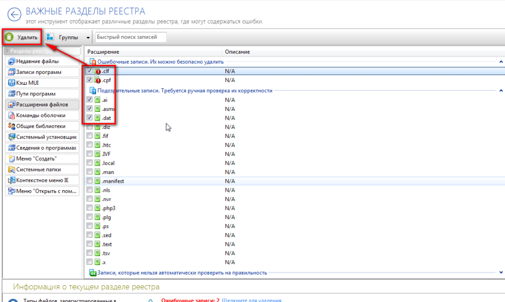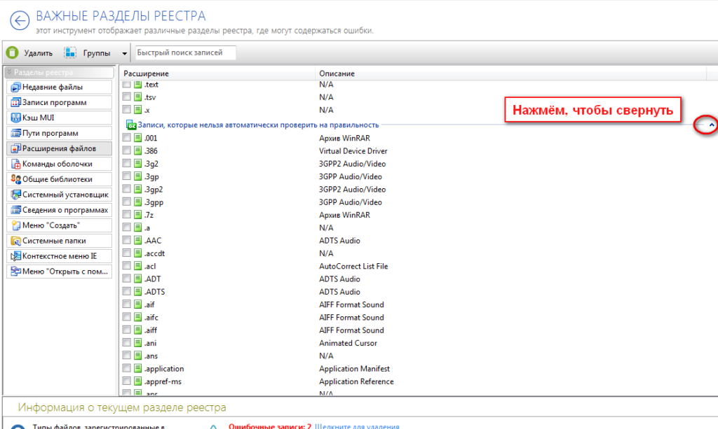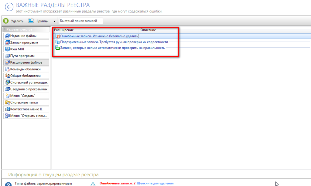 В нижней части окна выводится информация о выделенном разделе (какие элементы содержит и сколько), об ошибочных записях в нём (если таковые имеются). Записи с ошибками можно удалить, нажав соответствующую надпись.