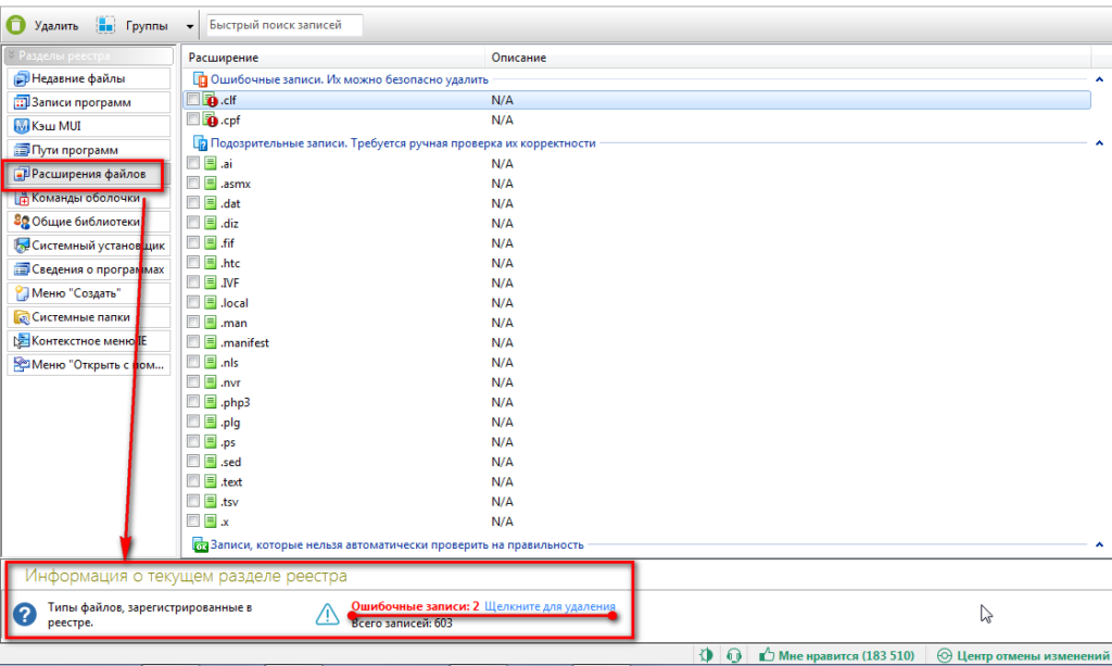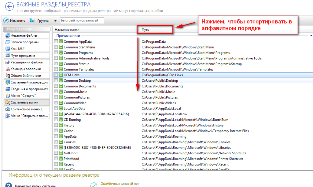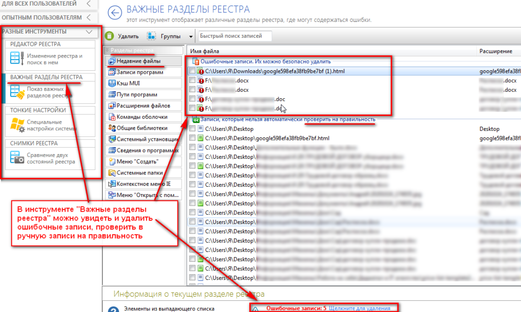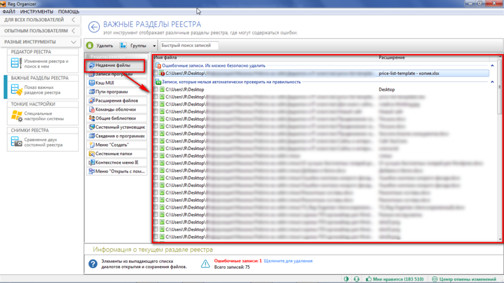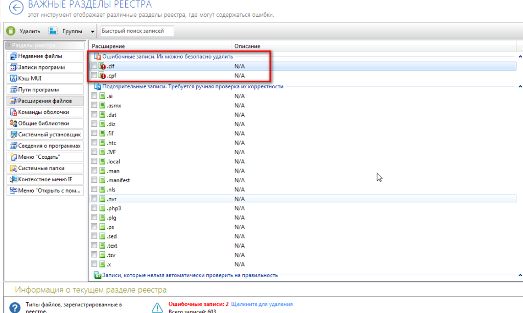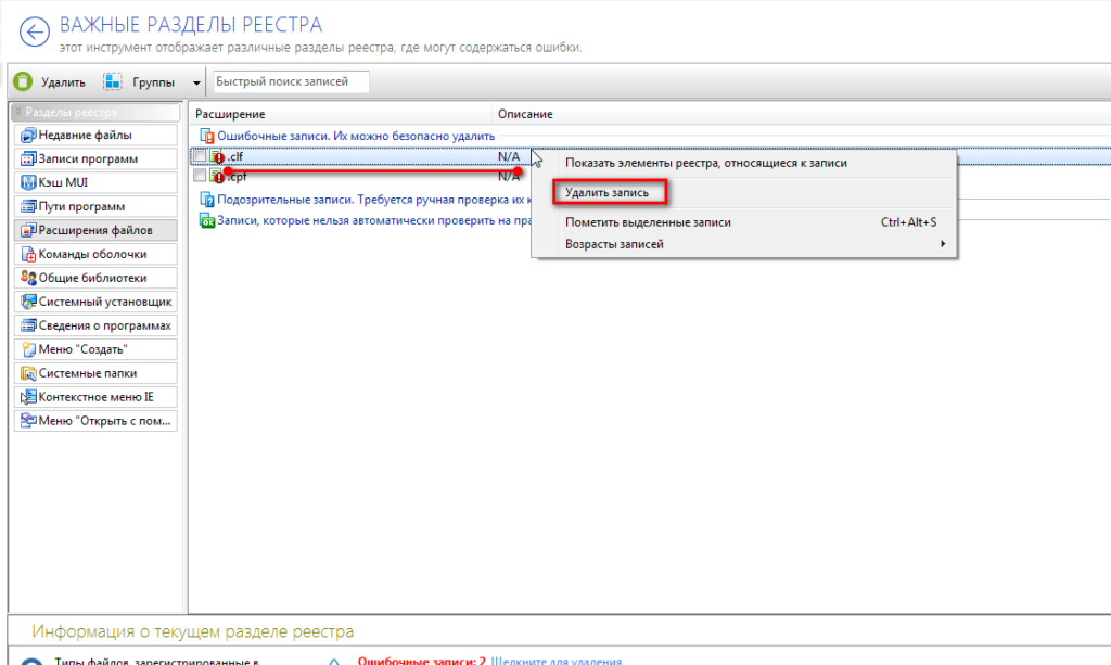 В нижней части окна выводится информация о выделенном разделе (какие элементы содержит и сколько), об ошибочных записях в нём (если таковые имеются). Записи с ошибками можно удалить, нажав соответствующую надпись.