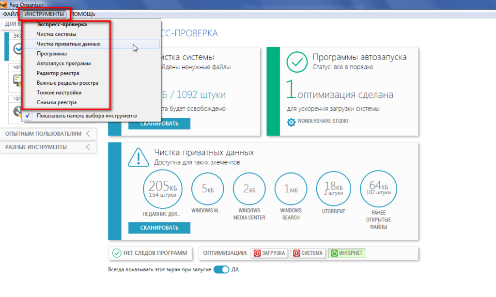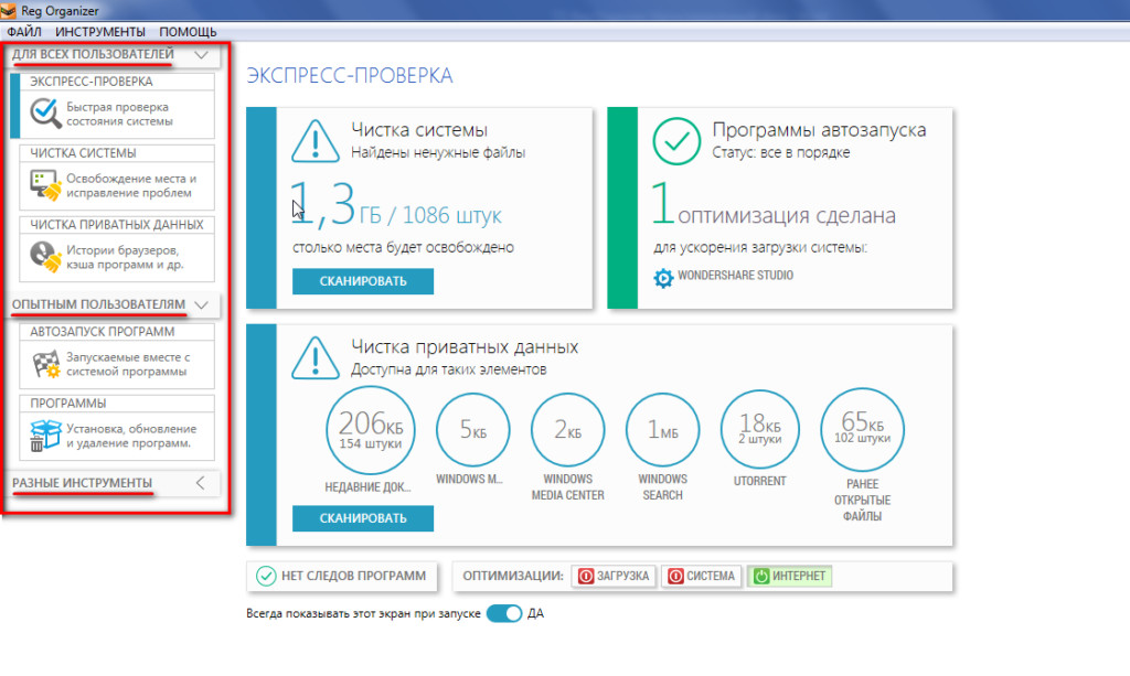 Сориентироваться проще с помощью левого меню: сразу видно, какие функции «органайзера» можно использовать смело (раздел «Для всех пользователей»), а какие – с осторожностью (раздел «Опытным пользователям»). Все пользователи могут провести экспресс-проверку системы и чистку (системы и приватных данных)