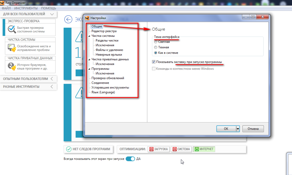 Здесь можно настроить работу инструментов: «Редактор реестра», «Чистка системы», «Чистка приватных данных» и «Программы». В разделе «Общие настройки» выбирается тема интерфейса, заставка при запуске Reg Organizer. В «Проверке обновлений» настраиваются уведомления об обновлениях Reg Organizer. В «Соединение» изменяются настройки прокси-сервера (если вы используете прокси-сервер для связи с Интернетом). В «Устаревшие инструменты» можно включить инструменты: