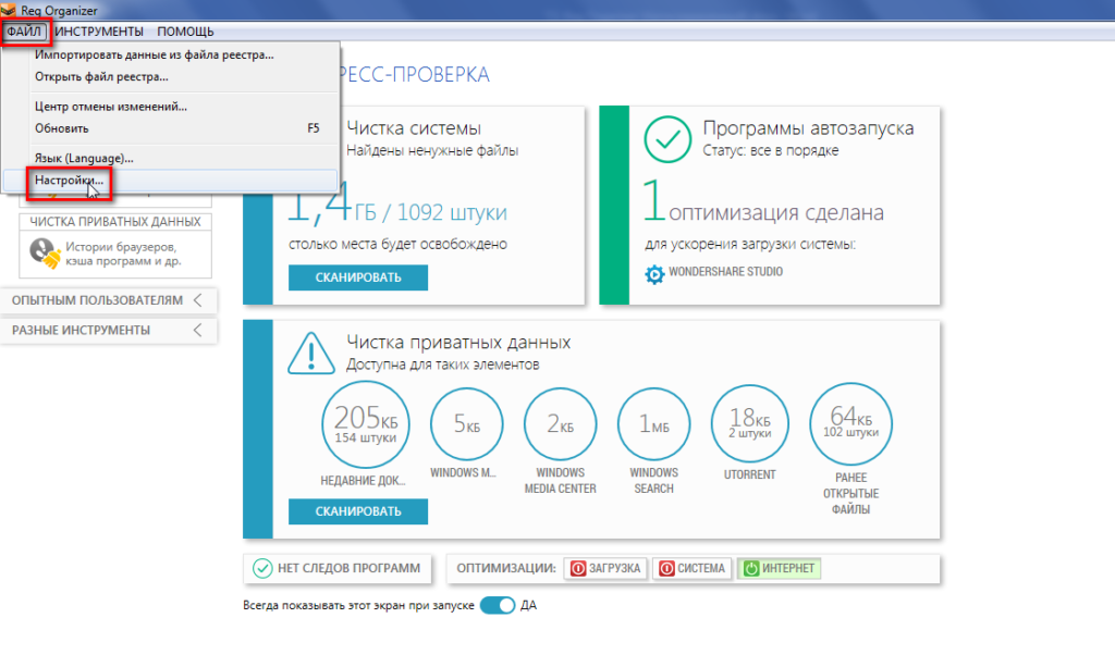 Как и в любой программе, в Reg Organizer есть настройки (главное меню, пункт «Файл»).
