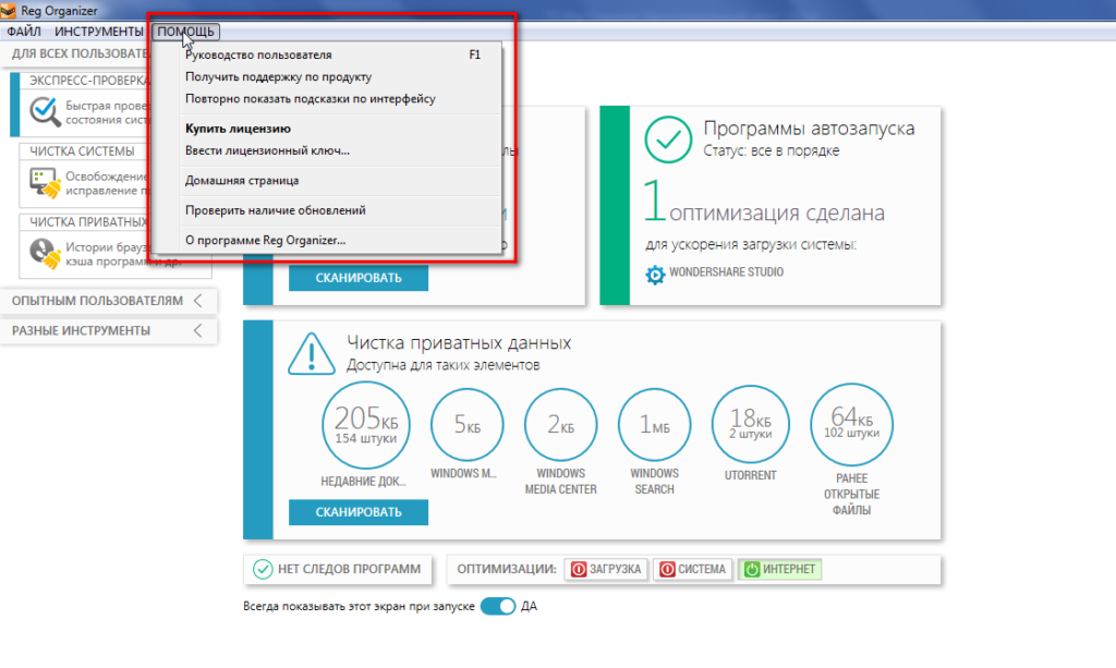 Через пункт «Помощь» в главном меню открывается руководство пользователя, можно запросить поддержку разработчика, открыть подсказки по интерфейсу, купить лицензию или вставить лицензионный ключ, проверить Reg Organizer на обновления и прочесть сведения о программе.