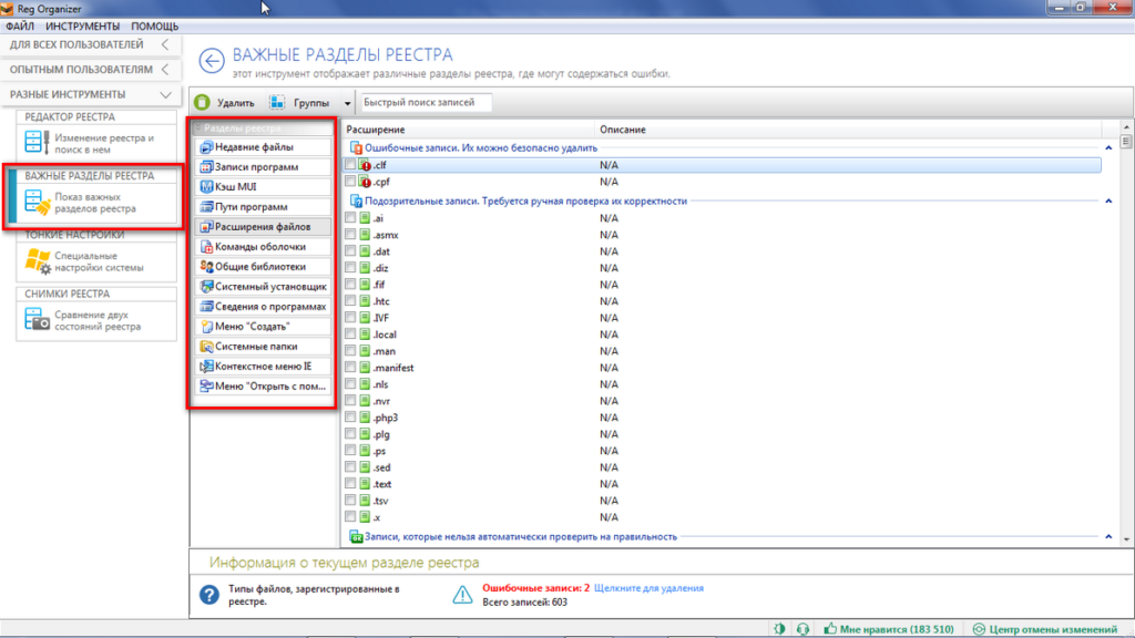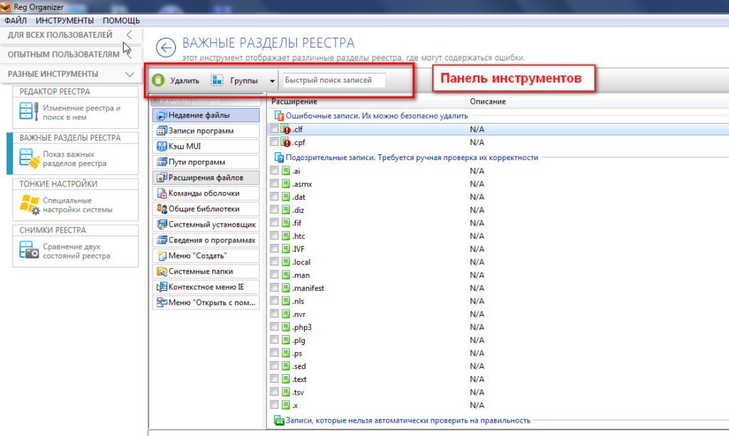 Но если классифицировать содержимое системного реестра по смыслу и в зависимости от наличия ошибок, разделов получится гораздо больше. Откроем «Важные разделы реестра» в «Разных инструментах», чтобы просмотреть, как Reg Organizer классифицирует элементы реестра.