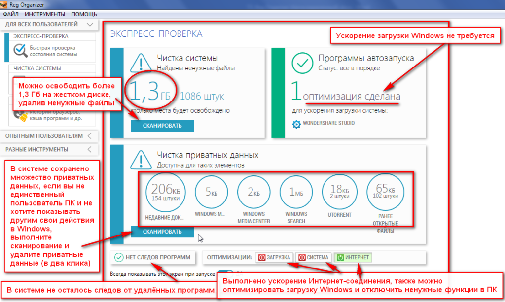 При запуске «органайзера» автоматически проводится экспресс-проверка. Эта функция позволяет проверить основные компоненты Windows. И слово экспресс в названии функции совершенно уместно: проверка осуществляется за несколько секунд. Помимо показателей программа по результатам проверки выдает рекомендации. Оцените, насколько система заполнена ошибками: результаты проверки отображаются в окне Reg Organizer справа. Можно быстро понять, каким инструментом стоит воспользоваться в первую очередь. Пример того, как анализировать результаты, представлен на скриншоте ниже.