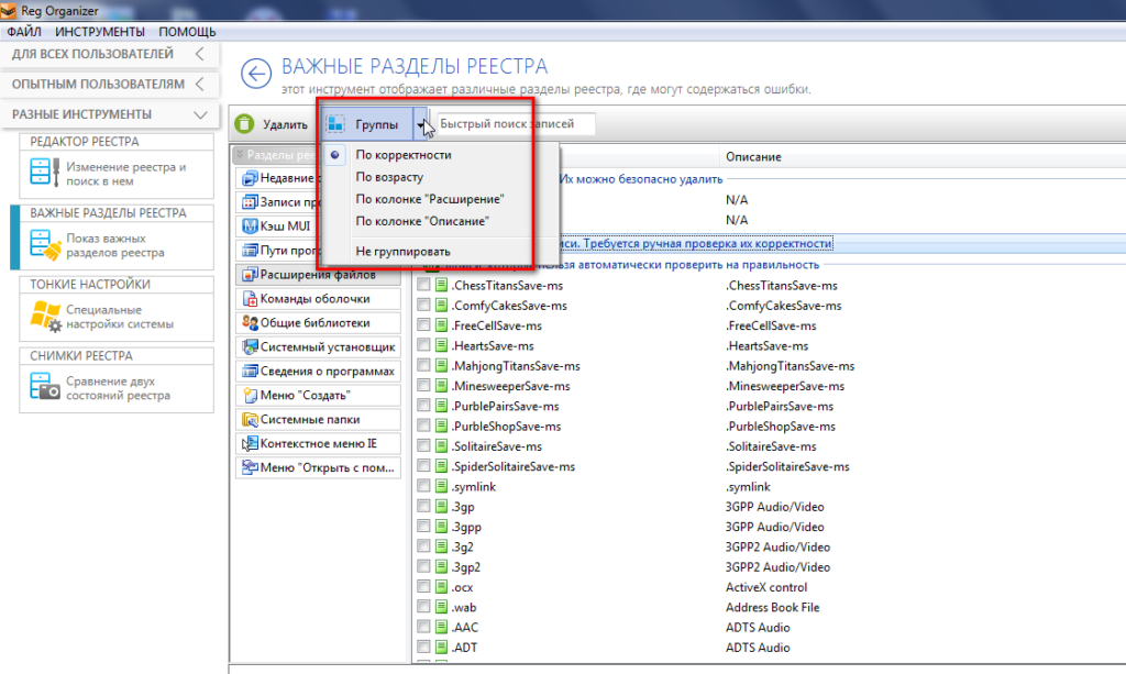 Инструмент «Важные разделы реестра» извлекает информацию из системного реестра и сортирует по разделам, каждый из которых отвечает за определенный аспект функционирования Windows. Например, в разделе «Записи программ» объединены все записи ПО, зарегистрированном в системном реестре. В «Расширениях файлов» перечислены типы файлов, зарегистрированных в реестре.