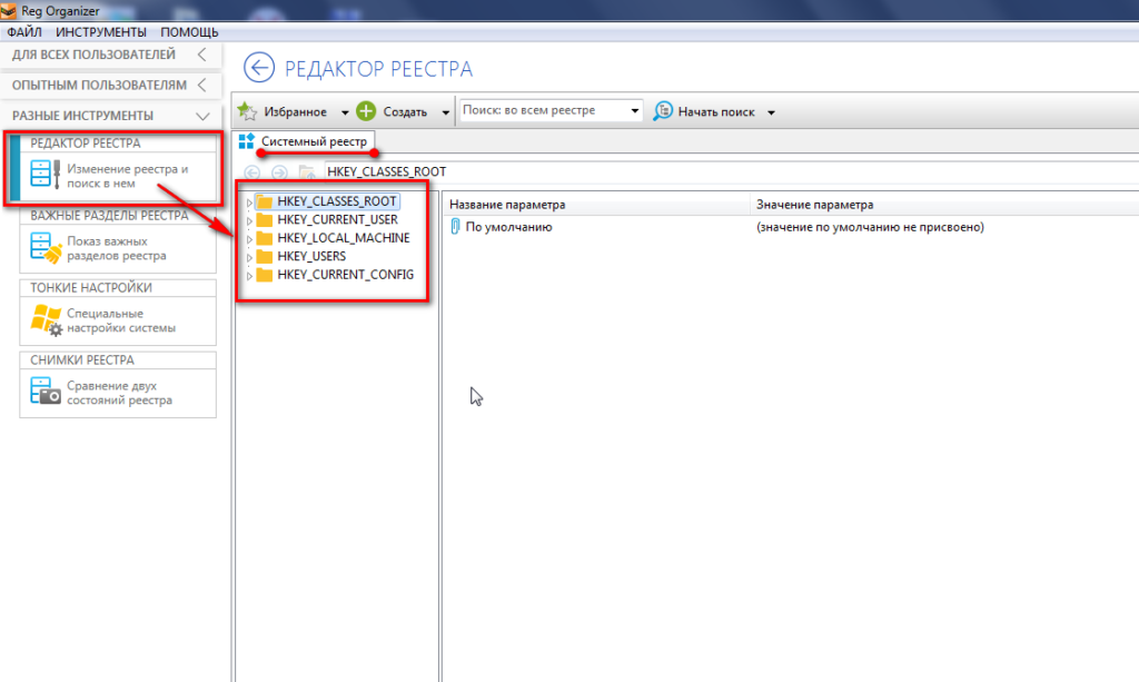 В главном меню в подпункте инструменты представлены все функции Reg Organizer вперемешку (для всех и опытных).