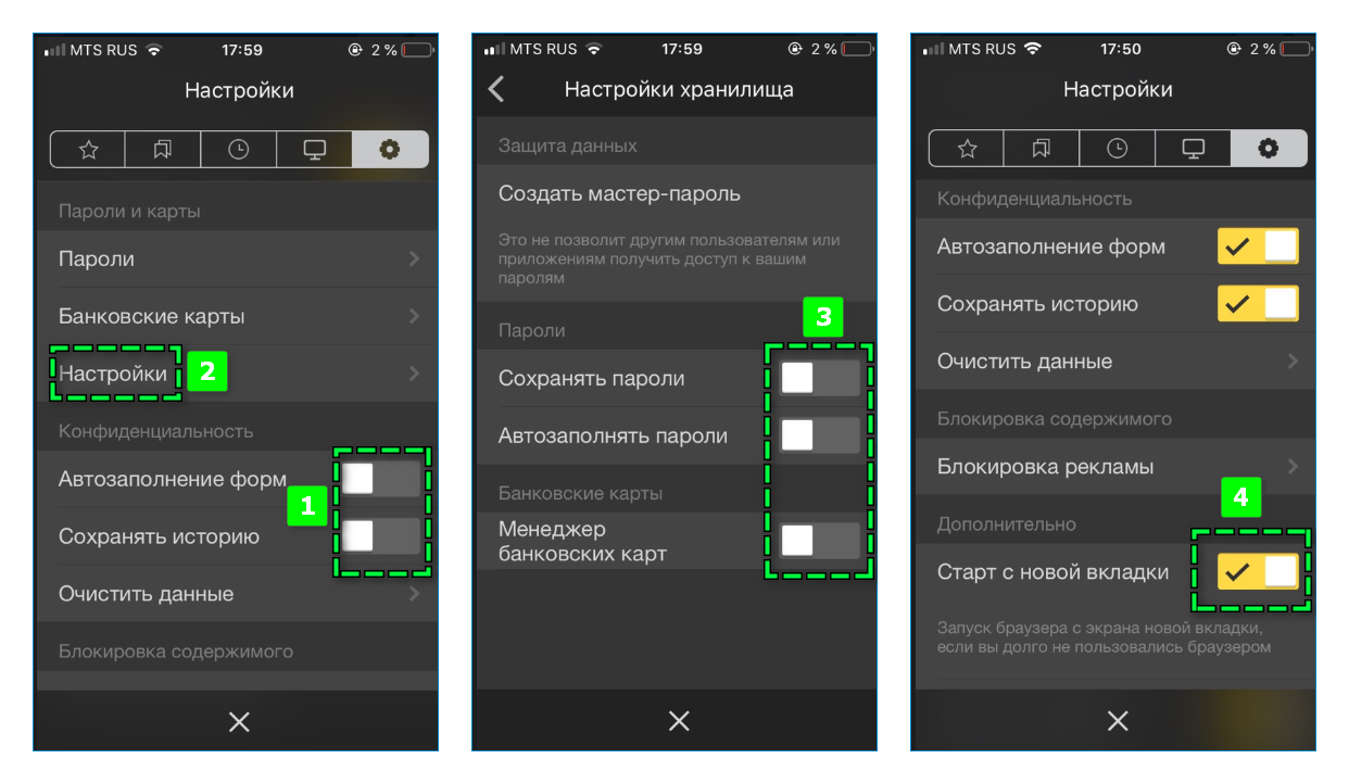 Вручную создать своеобразный режим Инкогнито можно, если переместить ползунки влево на следующих пунктах: