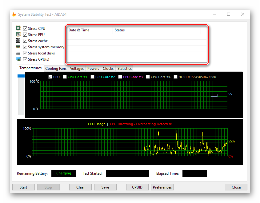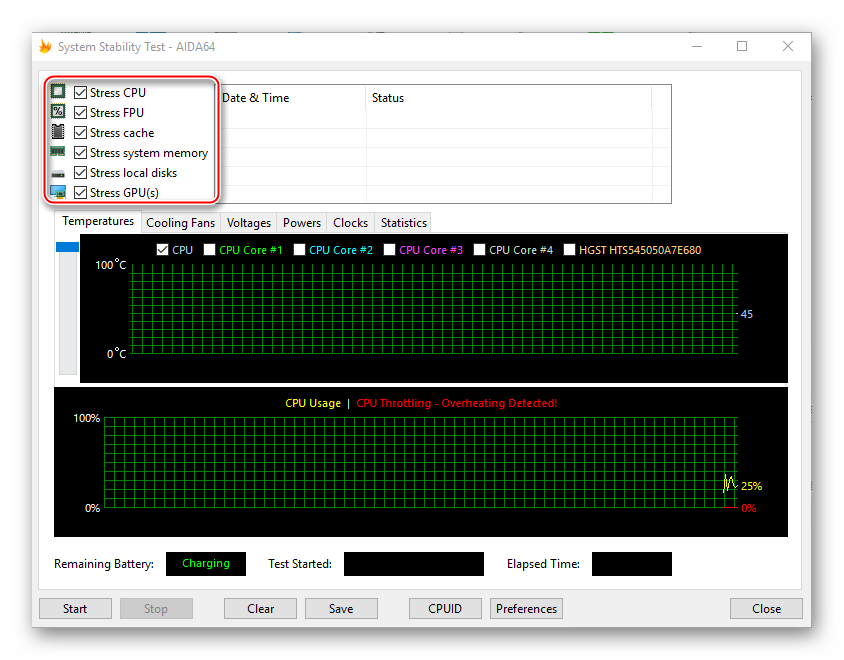 - Stress CPU – при отметке этого пункта во время теста особо сильно будет нагружаться центральный процессор;