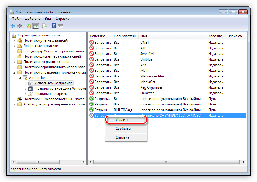 Удаление исполняемых правил из списка производится следующим образом: нажимаем ПКМ по одному из них (ненужному) и выбираем пункт «Удалить».