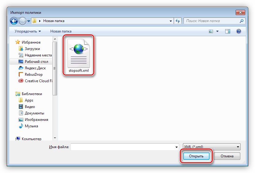 Далее находим сохраненный (скачанный) файл XML и нажимаем «Открыть».