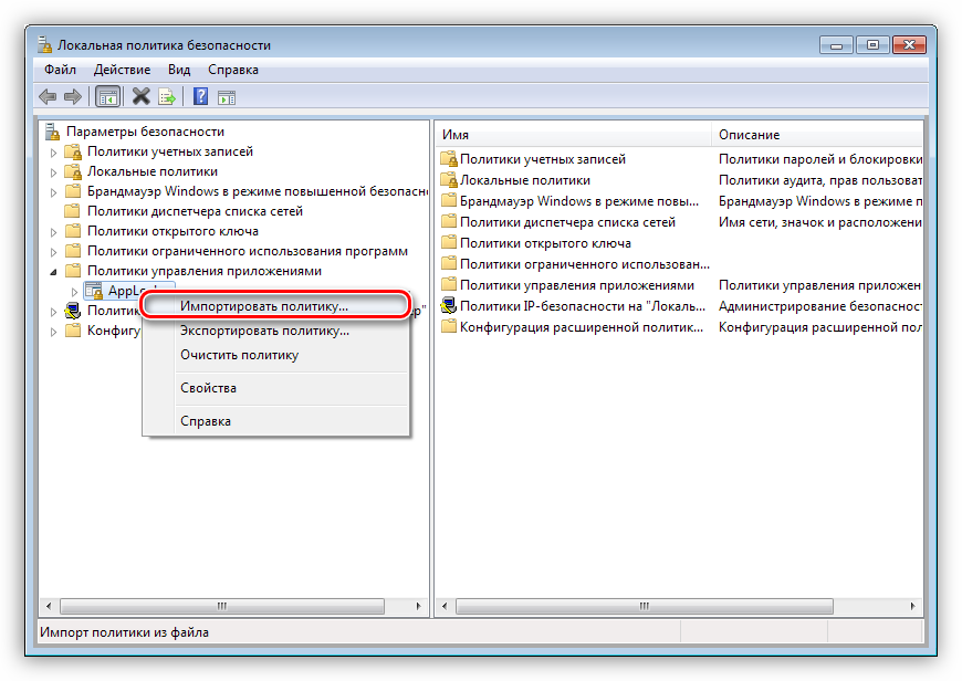 - Кликаем по разделу «AppLocker» ПКМ и выбираем пункт «Импортировать политику».