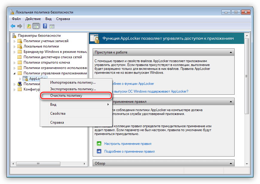 В «AppLocker» также существует функция полной очистки политики. Для этого кликаем ПКМ по разделу и выбираем «Очистить политику». В появившемся диалоговом окне нажимаем «Да».