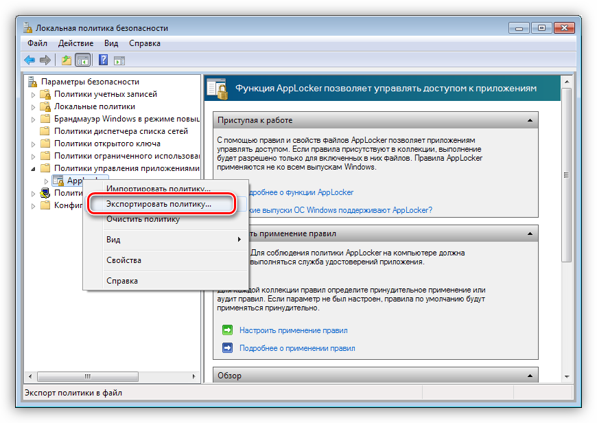 - Кликаем правой кнопкой мыши по разделу «AppLocker» и находим пункт контекстного меню с названием «Экспортировать политику».