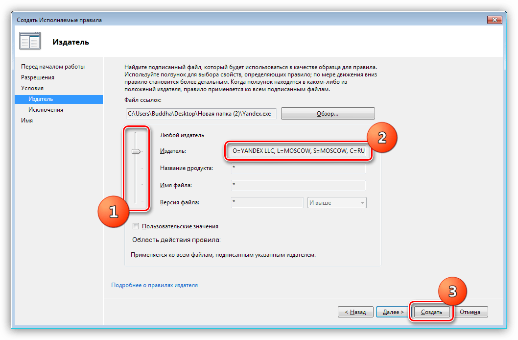 Двигая ползунок вверх, добиваемся того, чтобы информация осталась только в поле «Издатель». На этом настройка завершена, нажимаем кнопку «Создать».