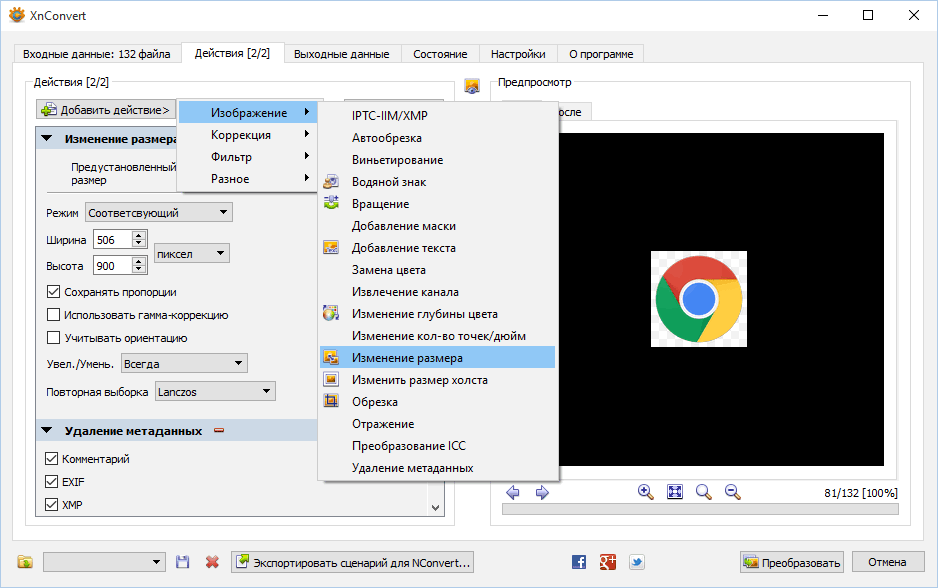 Размеры изображений можно указывать в пикселях, процентах, дюймах, сантиметрах и миллиметрах. Предусмотрено несколько режимов, например настройка по наибольшей стороне или масштабирование в мегапикселях, и опять же никто не мешает выбрать один из заранее настроенных размеров. Стоит отметить, что XnConvert подходит и для комплексной обработки фотографий. Вы сможете поворачивать, обрезать, отражать их, удалять метаданные, наносить водяные знаки, текст, QR-коды, корректировать картинку с помощью специальных инструментов и фильтров.