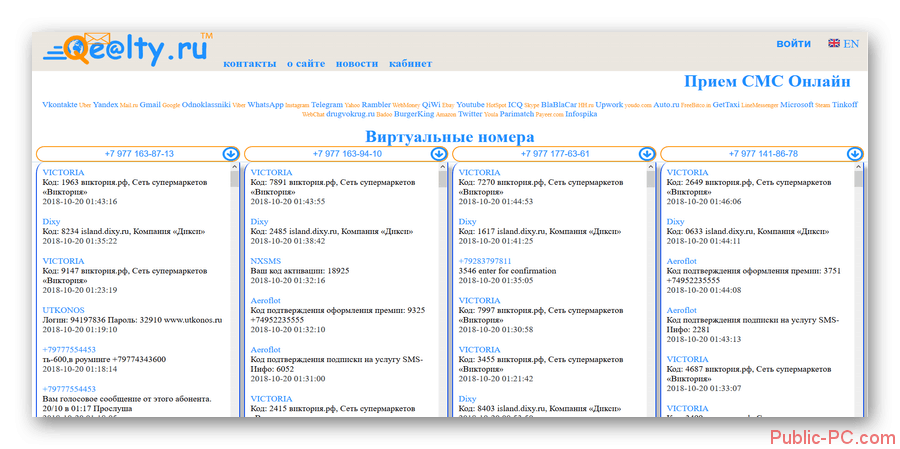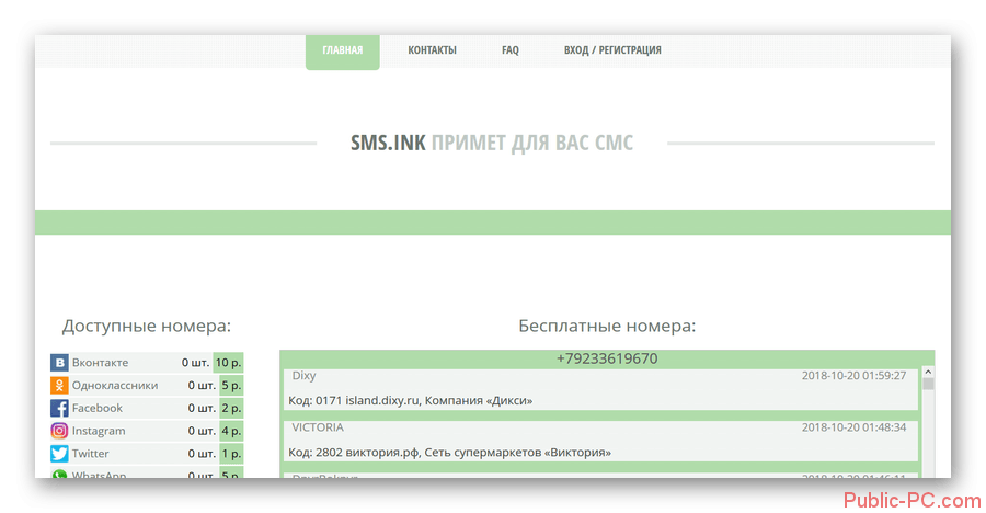 Этот сервис не так популярен, как предыдущий, но иногда это бывает весьма кстати. Если вам необходимо зарегистрировать аккаунт в какой-либо социальной сети — это идеальный вариант. Ведь на раскрученных сайтах, скорее всего, все доступные номера уже давно применялись для этой цели. Одновременно можно использовать 4 номера, а база доступных вариантов регулярно меняется. Дату следующего обновления можно посмотреть сразу под колонками с сообщениями.