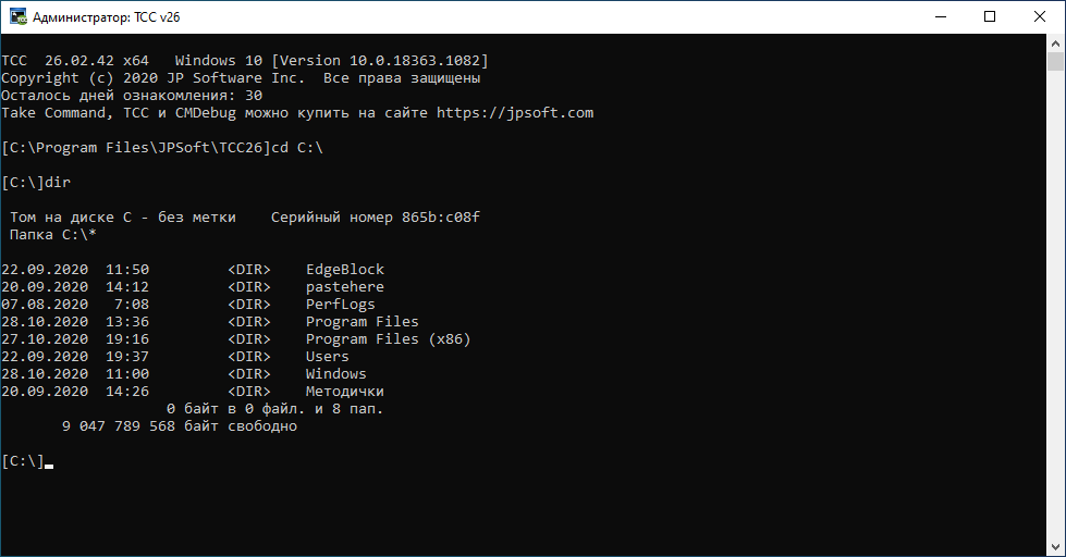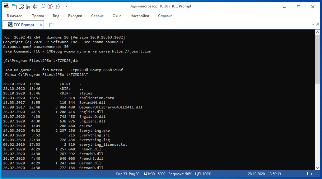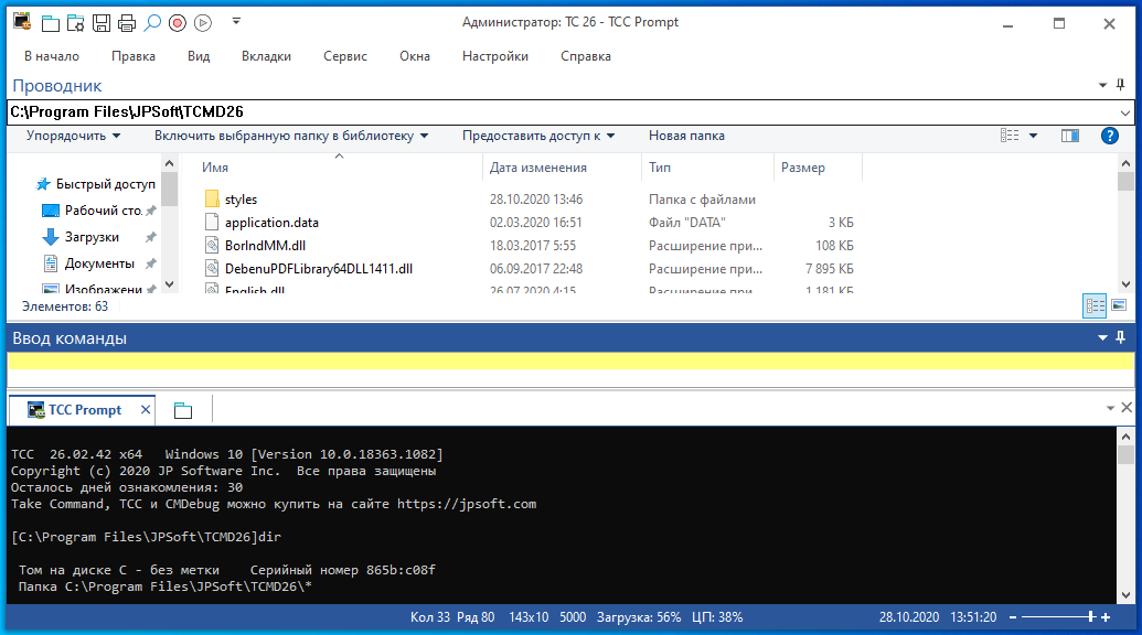 Take Command — полноценная замена штатному интерпретатору командной строки от разработчиков JP Software с множеством дополнительных функций и поддержкой более 200 команд, отсутствующих в стандартной командной строке. В верхней части окна Take Command расположена лента наподобие той, которая имеется в приложениях Microsoft Office и Проводнике Windows 10.