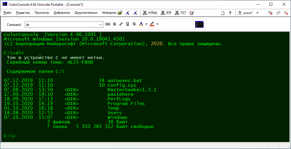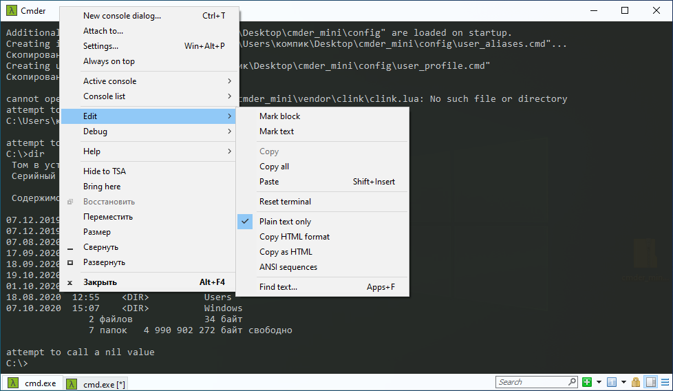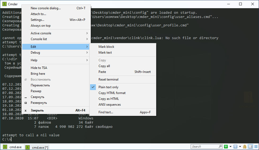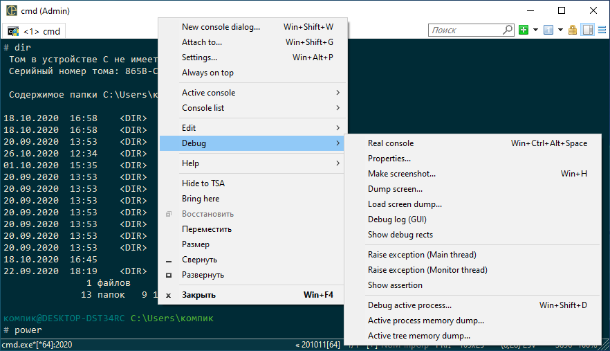 Альтернативная командная строка с прицелом на использование цветовой гаммы, копирования и экспорта данных. Бесплатна, поддерживает русский язык интерфейса, есть портативная версия, имеет в верхней части окна текстовое меню. Дополнительные возможности приложения включают: