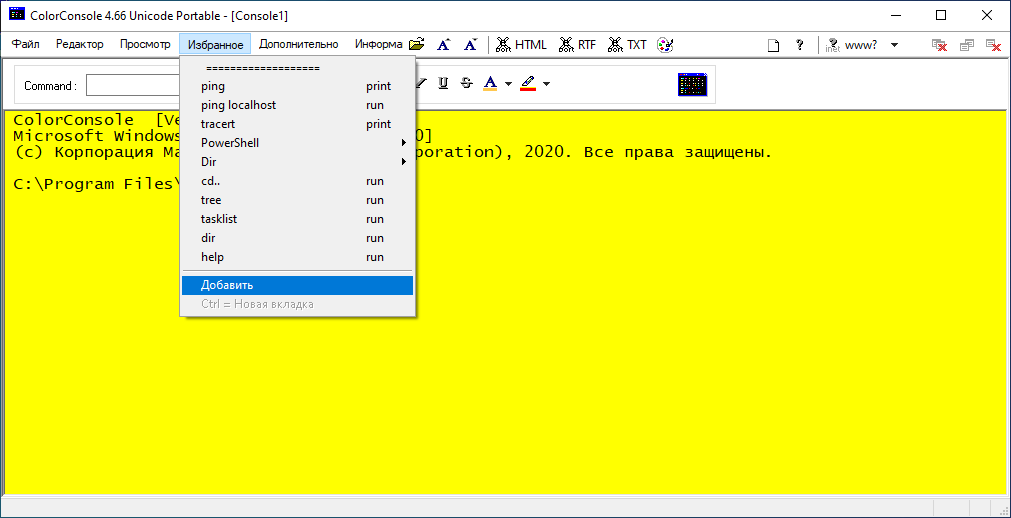 - Сохранение содержимого консоли в файлы формата HTML, RTF и TХT.