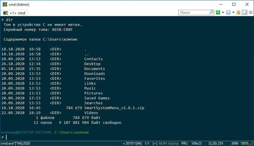 Распространяясь в двух портативных редакциях — Mini и Full, эта альтернатива командой строки на базе ConEmu и расширениями Clink делает упор главным образом на функциональность, более всего близкую к функциональности современных версий PowerShell. Mini-версия Cmder внешне мало чем отличается от стандартной консоли, но имеет несоизмеримо больше настроек.
